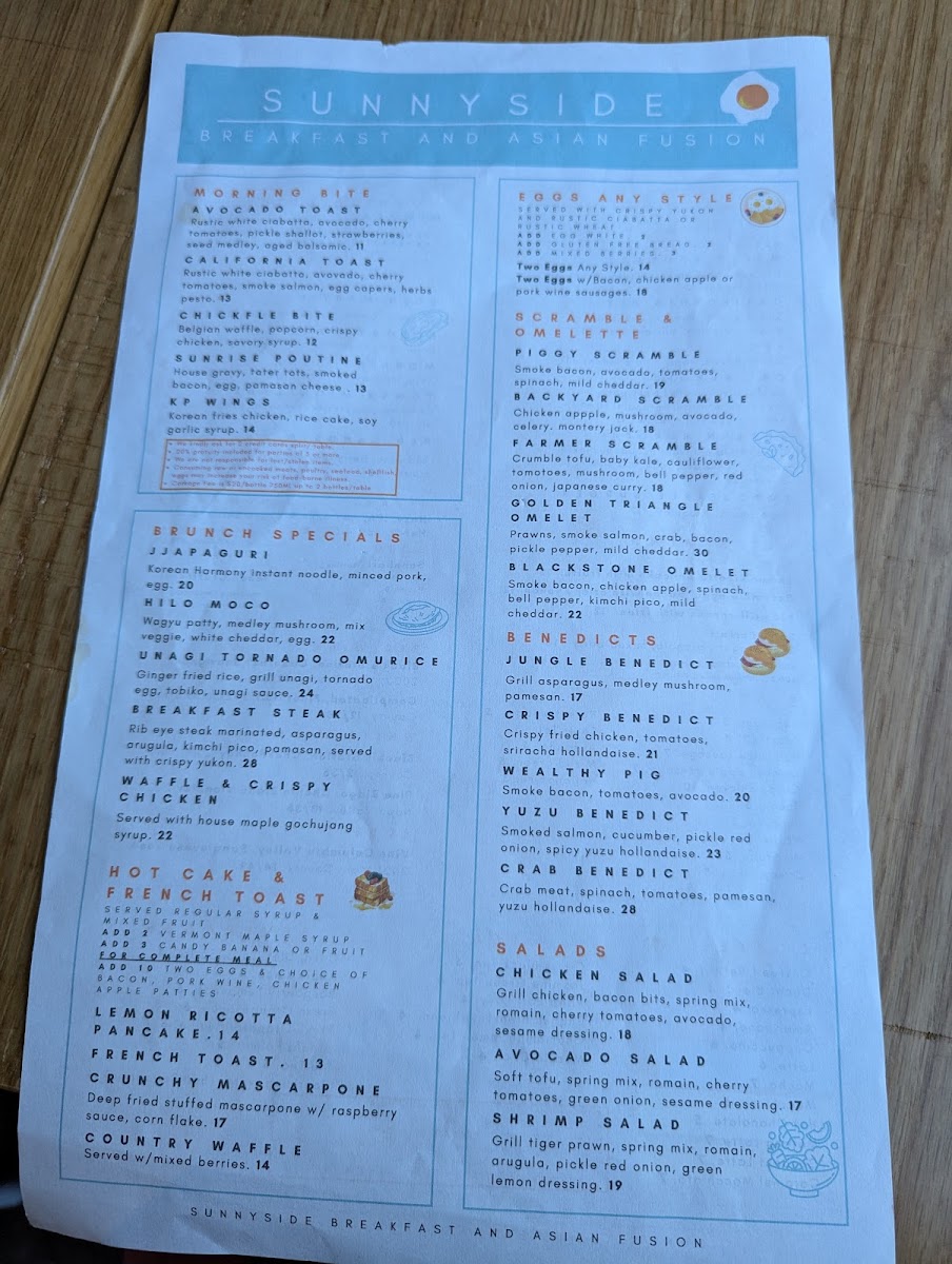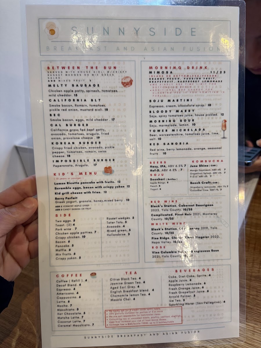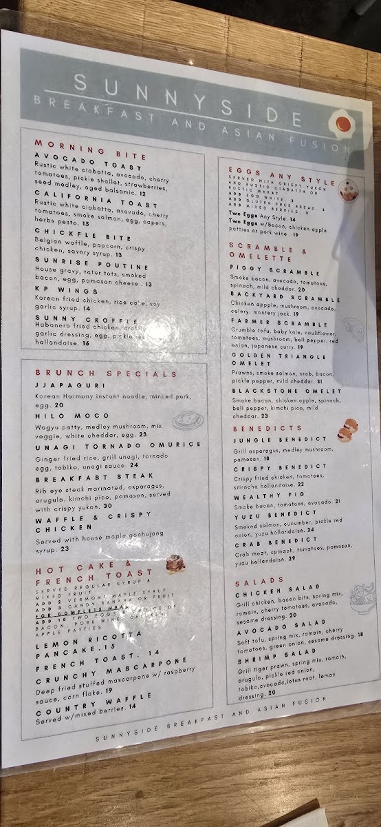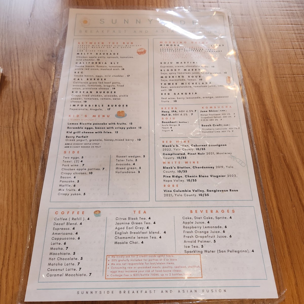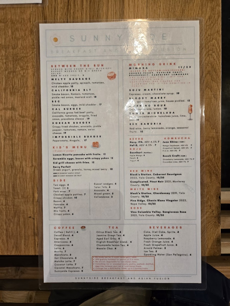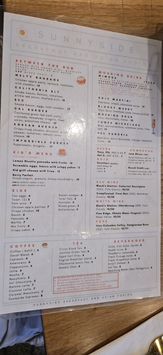 If you're in the mood for a hearty start to your day, the Sunny Side Breakfast Menu at 1221 19th St, Sacramento, CA 95811, has exactly what you're craving. From classic comfort foods to unique twists on traditional dishes, there’s something here to satisfy every breakfast lover. The fluffy pancakes, crispy bacon, and rich omelets are just the beginning. For those looking for something a bit lighter, the fresh fruit bowls and yogurt parfaits offer a refreshing option. Whether you're enjoying a lazy weekend morning or need something filling before heading out, the Sunny Side offers a warm and welcoming atmosphere, where each dish is made with care. With an inviting selection that caters to all tastes, you’ll find your perfect breakfast here.